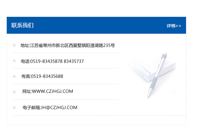 傳真:0519-83435688    郵編:213135    網址:WWW.czjhgj_com.xiangzhang18.com    電子郵箱:JH@czjhgj_com.xiangzhang18.com